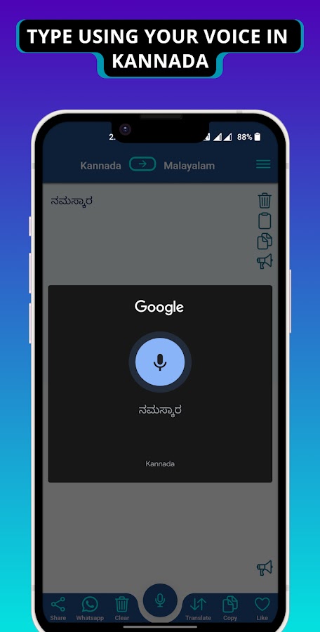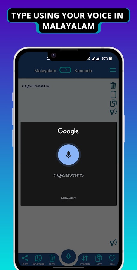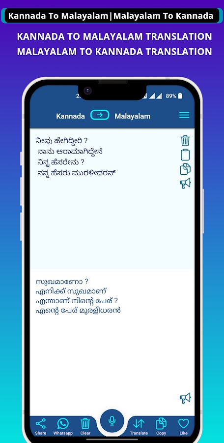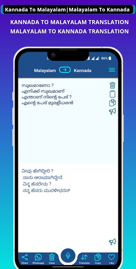 С помощью этого классного приложения вы можете ввести каннада и перевести каннада на малаялам. Это приложение предоставляет функцию произношения для прослушивания переведенного текста на разной высоте, чтобы вы могли четко понимать произносимые слова. Вы можете легко скопировать и поделиться переведенным текстом в любом приложении для обмена сообщениями, чата или социальных сетей.