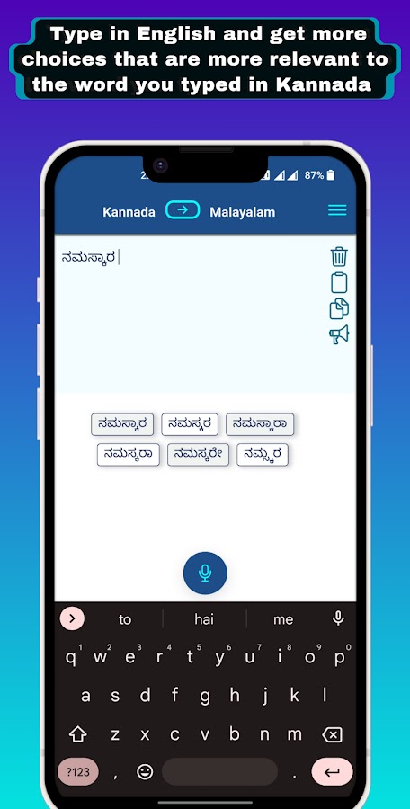 ПЕРЕВОД КАННАДА НА МАЛАЯЛАМ: приложение также поддерживает обратный перевод, что позволяет легко конвертировать текст с каннада на малаялам. Эта функция идеально подходит для двуязычных пользователей или тех, кто хочет улучшить свои языковые навыки.