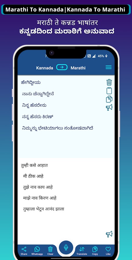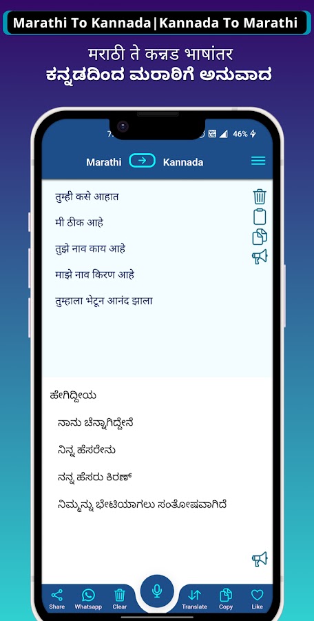 ПЕРЕВОД КАННАДА НА МАРАТХИ: приложение также поддерживает обратный перевод, что позволяет легко конвертировать текст с каннада на маратхи. Эта функция идеально подходит для двуязычных пользователей или тех, кто хочет улучшить свои языковые навыки.