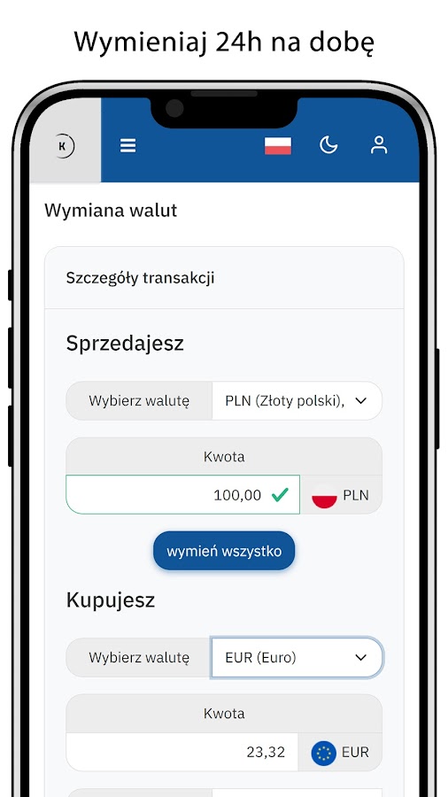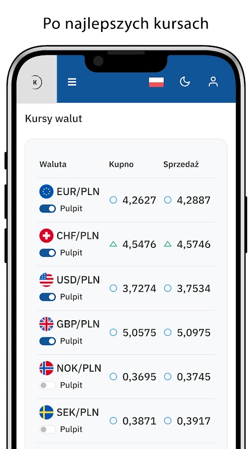 Kantor.pl — гарантия самого быстрого и выгодного обмена валюты. Обменные курсы, представленные в приложении kantor.pl, обновляются каждые 2 секунды, благодаря чему обмен происходит онлайн в текущих котировках рынка Forex.