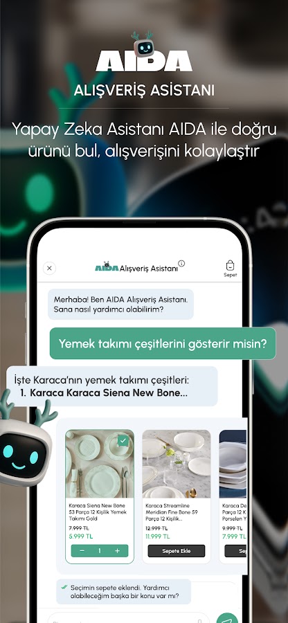Эксклюзивный помощник Karaca с искусственным интеллектом, AIDA, персонализирует ваш опыт покупок. Он сравнивает товары, предлагает варианты, основанные на вашем образе жизни, подсказывает рецепты и использует технологию дополненной реальности, чтобы показать вам, как товары будут выглядеть в вашем доме. Какой аэрогриль подойдет для моей кухни? Какой робот-пылесос лучше всего? Спросите AIDA и получите экспертную консультацию. Впервые в отрасли, только в Karaca.