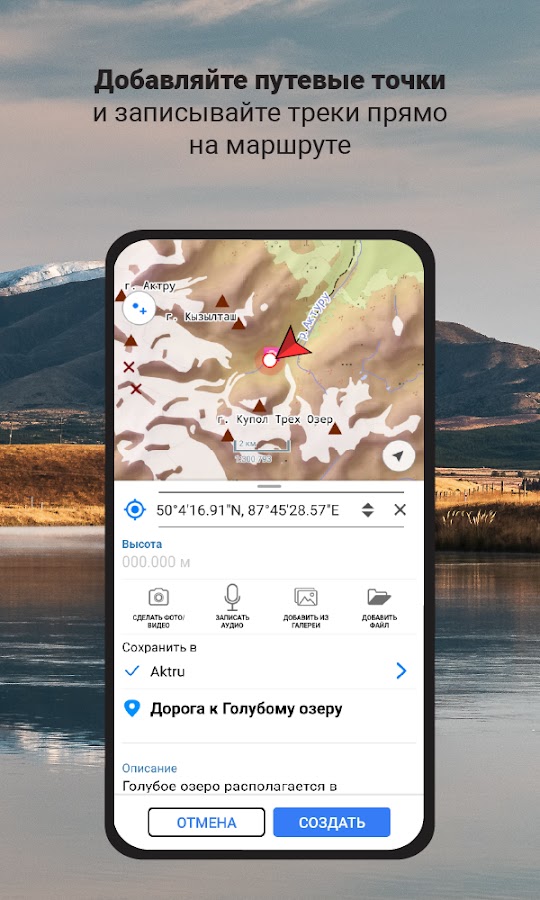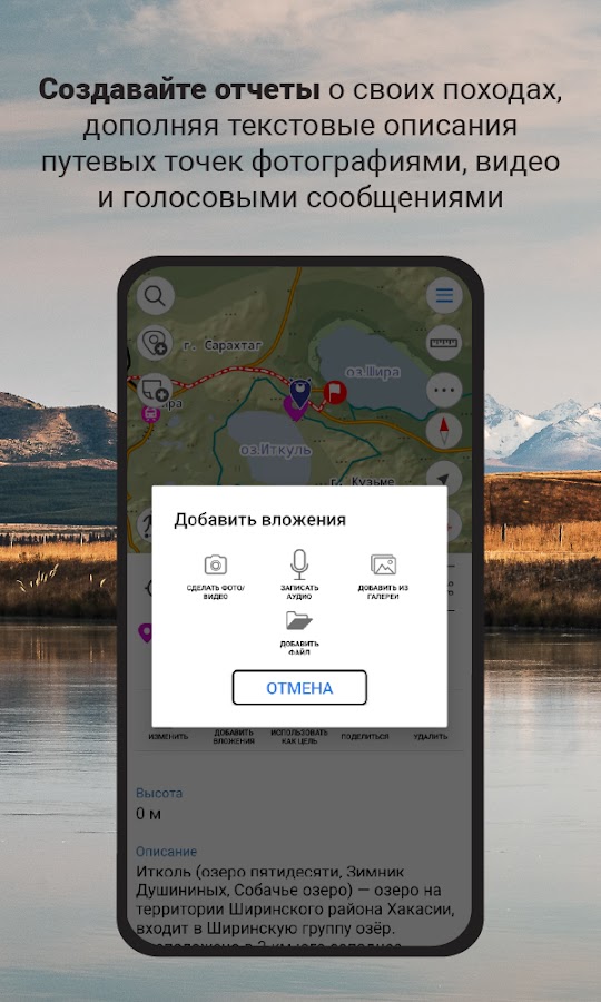 Сохраняйте всю важную для вас информацию о походе или прогулке непосредственно в приложении! Делайте пометки, наносите на карту точки, линии и полигоны, добавляйте к ним фотографии, видео ролики и голосовые комментарии, чтобы составить информативный отчет о своем приключении. По возвращении домой вы сможете легко поделиться ценной информацией с друзьями и коллегами.