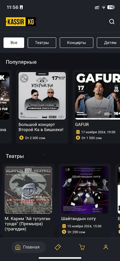 Погрузитесь в мир ярких впечатлений с Kassir.kg! Наше удобное и интуитивно понятное приложение предоставляет вам легкий доступ к самым захватывающим мероприятиям. Не нужно терять время на поиск билетов – всего лишь несколько касаний, и вы уже наслаждаетесь любимыми шоу, спектаклями, концертами и спортивными матчами. Мы ценим ваш комфорт, поэтому предлагаем разнообразные способы оплаты, чтобы сделать процесс покупки еще более удобным. Оставайтесь в курсе последних событий и новостей, чтобы не упустить ни одного яркого момента. Kassir.kg — ваш верный спутник в мире развлечений!