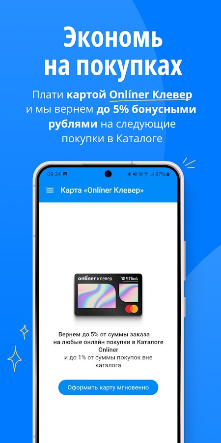 Карта «Onlíner Клевер» — кобрендинговая карта Onlíner и «МТБанка». Совершайте покупки в Каталоге с картой «Onlíner Клевер» и получайте возврат до 5% бонусными рублями. И до 1% с любой покупки вне Каталога. За бонусные рубли можно совершать новые покупки в Каталоге вплоть до 100% заказа: 1 бонус равен 1 рублю. Максимальный возврат с 1 заказа 50 бонусных рублей. Преимущества «Клевера»: