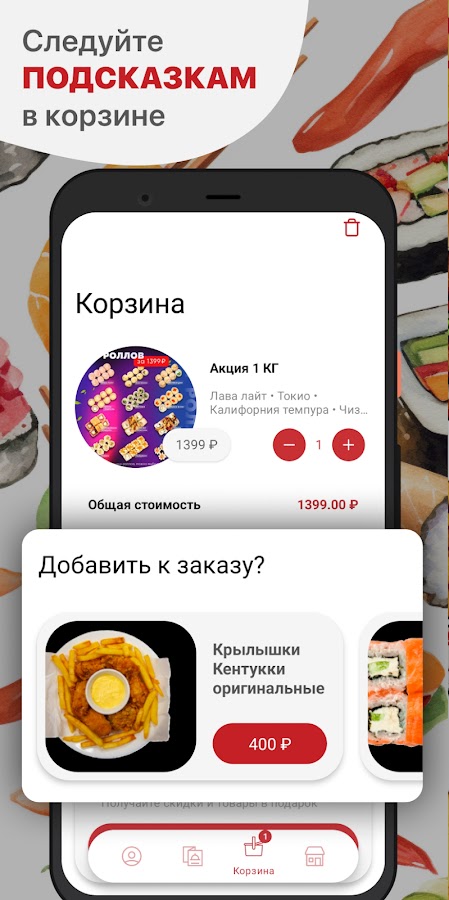 Как сделать заказ в приложении “Катана Суши”: выберите понравившиеся позиции из меню, добавьте их в корзину и перейдите на экран оформления заказа (по нажатию на иконку корзины).