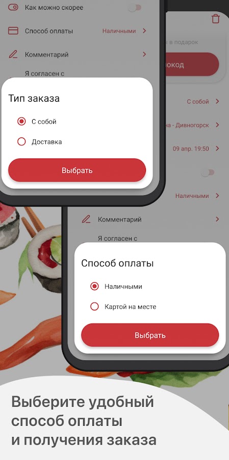 Укажите время, когда хотите прийти за своим заказом или выберите доставку с указанием времени и адреса доставки.