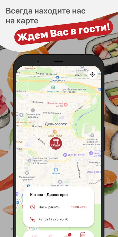 Мобильное приложение “Катана Суши” позволит вам легко и просто оформить и оплатить доставку, предзаказ или самовывоз суши и пиццы в Дивногорске и Сосновоборске.