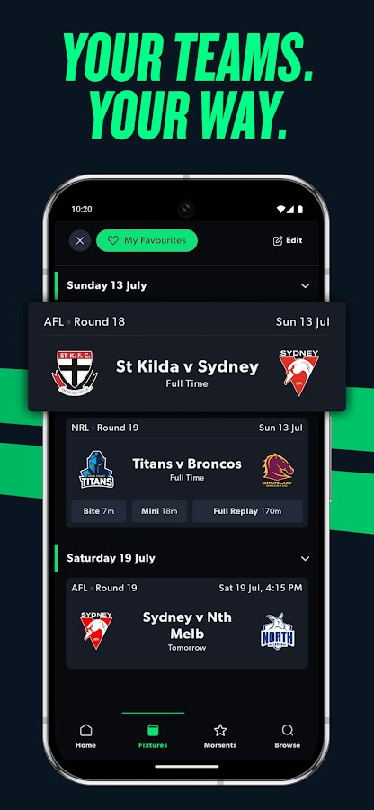 • Мини-повторы — хотите получить полный обзор матча или гонки всего за несколько секунд? Kayo Minis — это повторы, которые сжимают все самые важные моменты менее чем до 30 минут. Доступны мини-трансляции всех матчей AFL, NRL, F1®, Supercars и MotoGP, а также мини-трансляции ESPN для отдельных игр NBA и NFL, доступные в течение 72 часов.