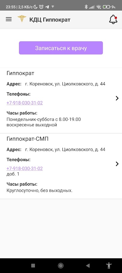 Официальное приложение Диагностического центра Гиппократ (г. Кореновск). Адреса и телефоны, график работы клиники. Всегда актуальная информация о специалистах, расписание приема, запись на прием с выбором удобной даты и времени, просмотр истории обращений, результатов анализов и обследований, отзывы. Оплата услуг банковской картой прямо из приложения с учетом индивидуальных скидок. Информация и уведомления от клиники.