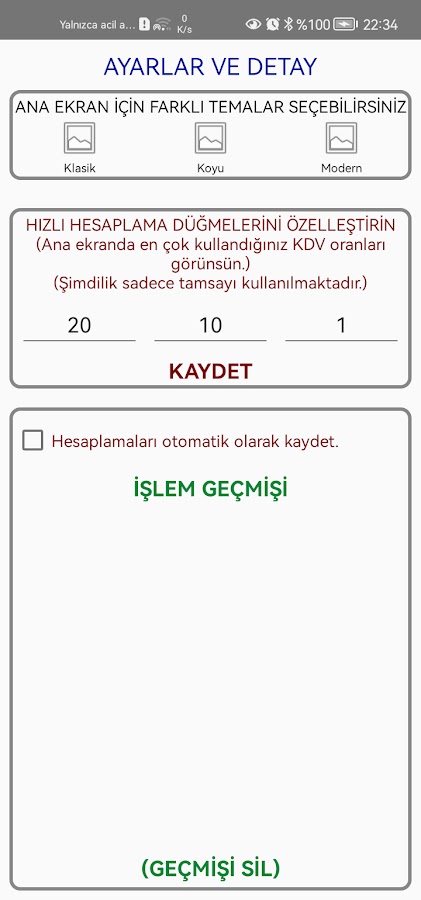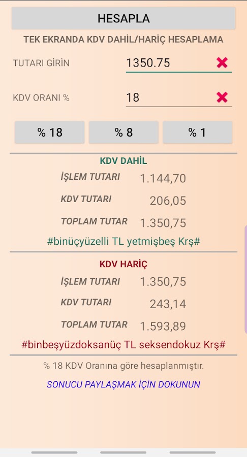 Это очень практичное, простое и простое приложение, которое не содержит рекламы, особенно для тех, кто использует счета-фактуры, которые могут занять время для расчета НДС. Введите сумму, укажите ставку НДС, нажмите кнопку РАСЧЕТ; этого достаточно. Вы можете увидеть информацию о НДС и НДС вместе.