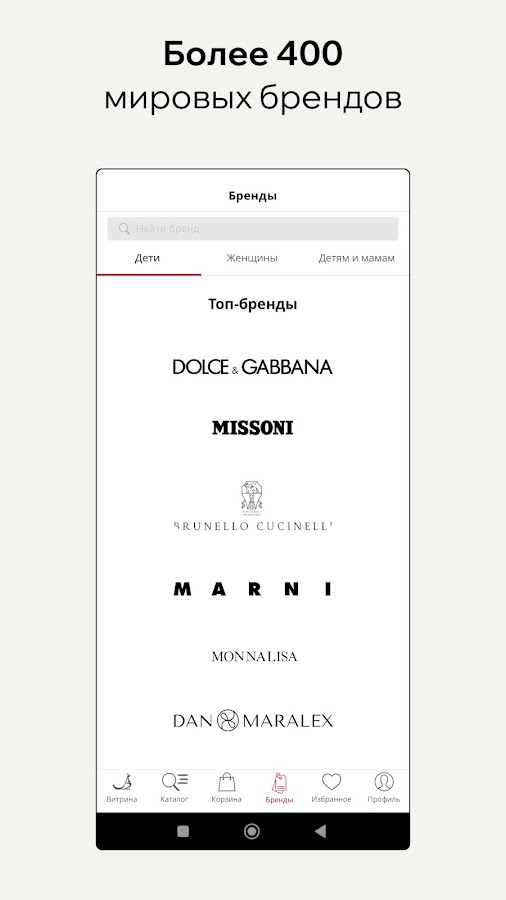 Комфортный онлайн-шопинг для детей и мам: брендовая одежда Dolce&Gabbana, Stella McCartney, Emporio Armani, Moschino, Diesel, Monnalisa. Dsquared2, N21, MSGM, Brunello Cucinelli, Marni, Alberta Ferretti, Missoni, Philosophy di Lorenzo Serafini, Roberto Cavalli, Diesel, MM6 Maison Margiela, Mo5ch1no Jeans, Twinset, Vivetta 120%Lino, Charo Ruiz и еще более 500 коллекций брендовой женской одежды, детской одежды и товаров для мам и детей.
