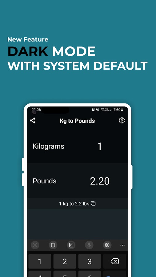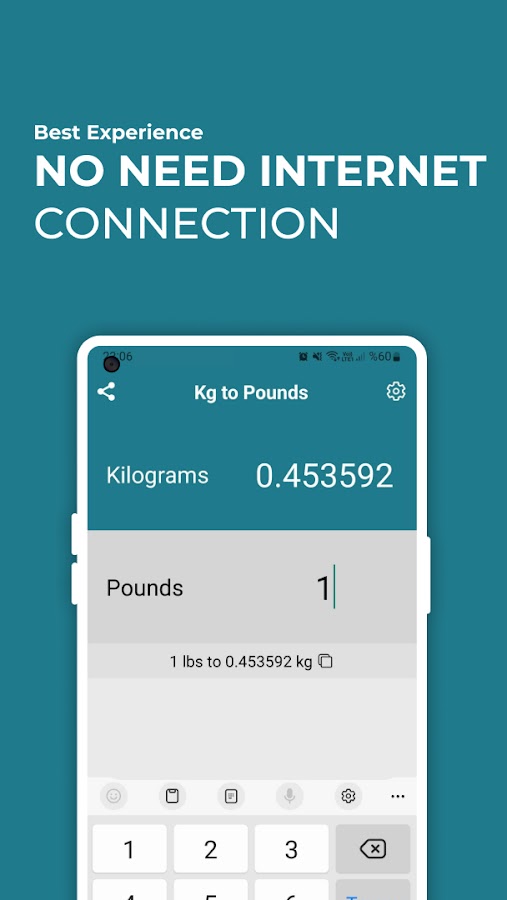 Фунты в килограммы: Аналогичным образом коснитесь поля ввода фунтов, введите свое число и увидите, как оно без задержки преобразуется в килограммы.