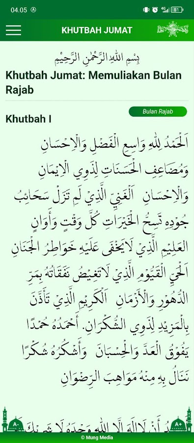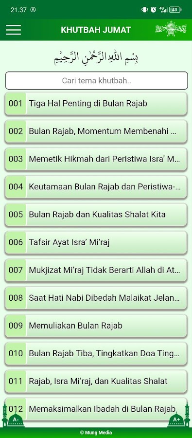 Приложение KHUTBAH ASWAJA разработано компанией Mung Media. Ожидается, что это приложение облегчит мусульманам, особенно проповедникам, подготовку проповедей. Надеемся, что приложение позволит проповедникам выбирать материалы для проповедей из коллекции, посвященной различным темам, актуальным в нынешней ситуации.