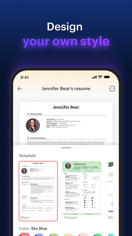 Мобильный конструктор резюме на базе ИИ от Kickresume позволяет легко создавать и редактировать резюме и сопроводительные письма где угодно. Вы можете использовать его исключительно на iPhone или продолжить работу с того места, на котором остановились, на компьютере (и продолжить на iPhone, если захотите). Все ваши резюме, CV, заявления об увольнении и сопроводительные письма хранятся в облаке и легко доступны из любого места, с любого устройства и в любое время.