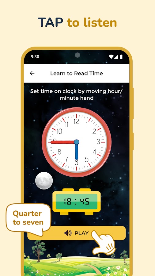 Наблюдайте, как ваш ребенок становится экспертом в определении времени, весело проводя время! Это приложение-часы для изучения времени включает в себя множество цифровых и аналоговых часов, с которыми дети могут взаимодействовать. Он предлагает регулируемые аналоговые часы для детей, чтобы они могли регулировать стрелки, менять время и видеть, как на часах выглядит разное время суток. Такой подход помогает детям научиться читать часы и понимать концепцию часов в игровой и интуитивной форме.