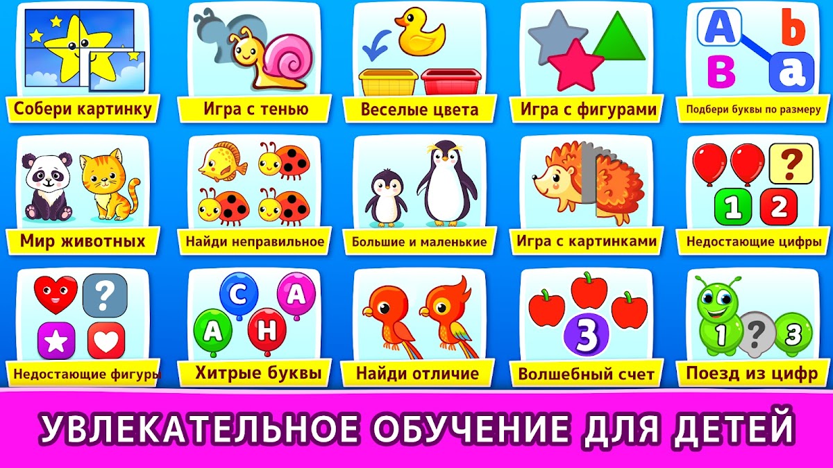 Хотите, чтобы ваш малыш, ребенок детсадовского возраста или дошкольник знал числа, понимал логику, определял фигуры, мог считать и запомнил английский алфавит? Эта коллекция бесплатных игр для детей послужит идеальной отправной точкой для приобретения таких умений. Детские игры для малышей содержит множества заданий для дошкольников, развивающие игры для малышей, игры для развития ума и многое другое!