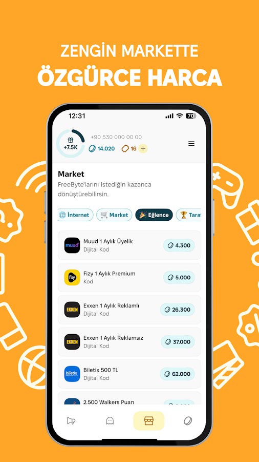 В мире FreeByte всё в ваших руках. Выбирайте любимые игры, определяйте свою стратегию и увеличивайте свой заработок! Зарабатывайте больше FreeByte, приглашая друзей, или конвертируйте накопленные баллы в интернет, рыночные ваучеры, цифровые подписки или игровые коды. Кроме того, вы можете получить дополнительные права и сюрпризы за свои баллы FreeByte.