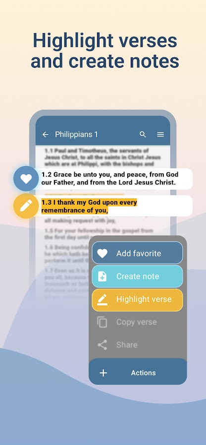 • Выделение, добавление в закладки и сохранение заметок для изучения Библии