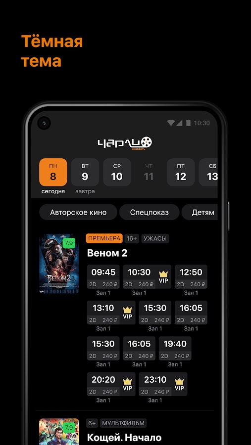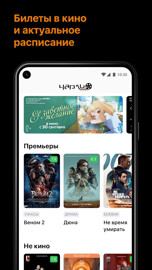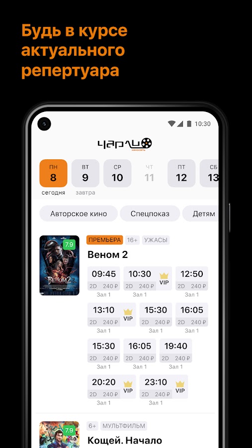 Узнавайте удобное расписание сеансов в кинотеатрах Чарли своего города. Выбирайте удобное время и дату для просмотра фильма, не выходя из приложения.