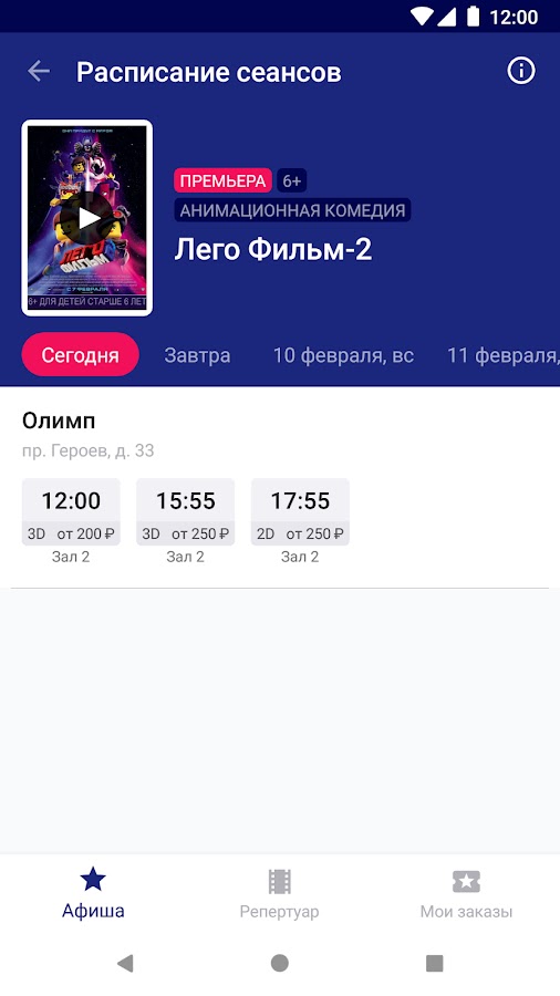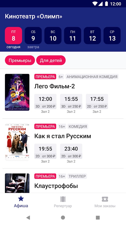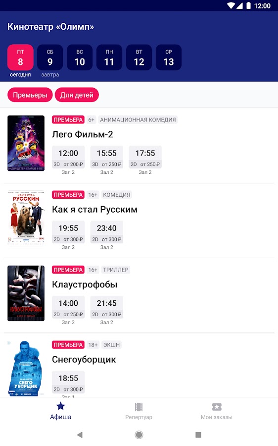 Мобильное приложение кинотеатра «Олимп» поможет вам подобрать удобный сеанс, узнать о новинках кинопроката и приобрести билеты в кино в Кириши.