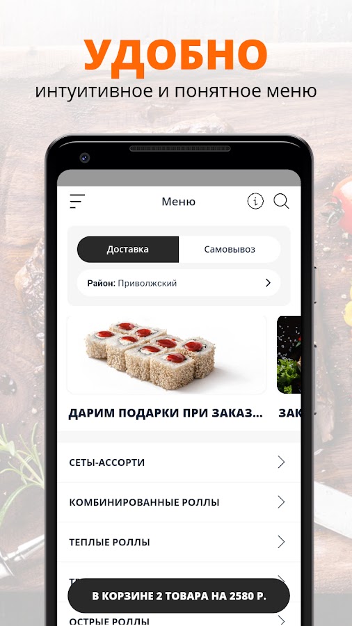 Закажите, пожалуй, лучшие роллы в приложении КИОТО СУШИ г. Казань! Всегда бесплатная доставка! Мы предлагаем Вам выбор из более чем 200 блюд: пицца, суши, роллы, сеты-ассорти, ВОК лапша, салаты, сэндвичи, десерты и напитки! Оформить заказ можно всего в несколько кликов. Также Вас всегда ждут приятные подарки при заказе. Оплата банковской картой через приложение или на сайте.