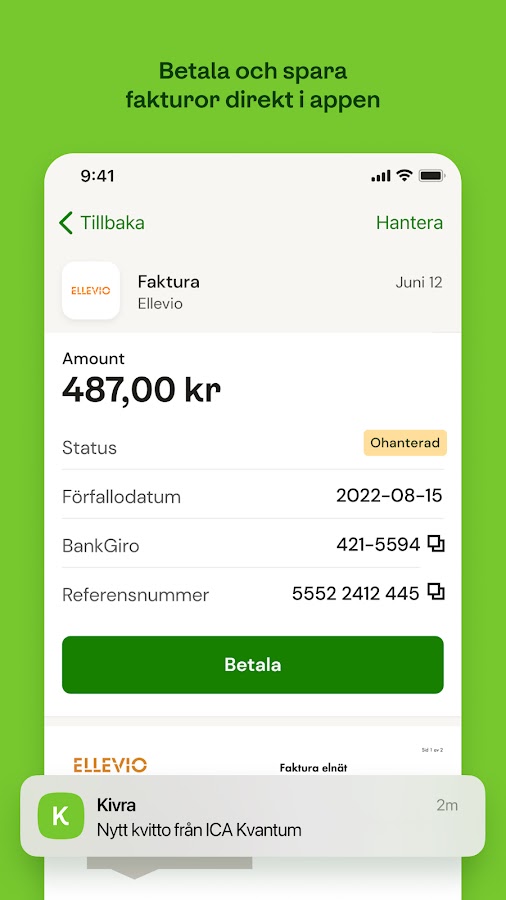 Kivra — это экологичная альтернатива бумажной почте и квитанциям. И для каждого документа, отправляемого и получаемого в Кивре, мы вместе предпринимаем шаги в правильном направлении для окружающей среды. С помощью нашей службы загрузки вы также можете выбрать и загрузить то, что важно для вас, и все это будет надежно сохранено с помощью Mobilt BankID.