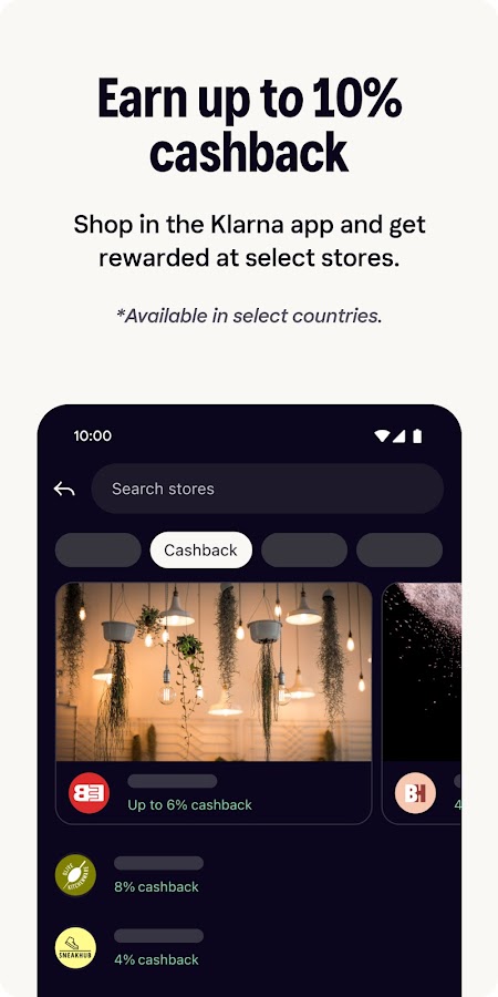 ³ Награды Klarna Cashback Rewards начисляются в виде баллов, которые можно обменять на зачисление на ваш баланс Klarna и другие преимущества. Получайте кэшбэк за покупки в приложении Klarna. Для получения кэшбэка необходим баланс счета Klarna. Выдача кэшбэка зависит от одобрения магазина и может зависеть от настроек файлов cookie, объединения предложений, исключения товаров или других факторов, не зависящих от нас. Действуют ограничения, условия и положения.