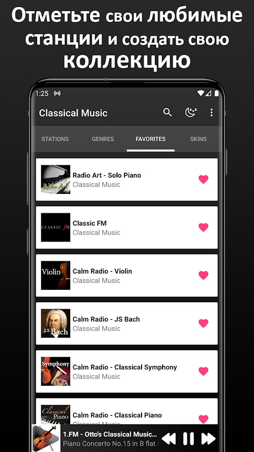 Мы приложили все усилия, чтобы объединить в одном приложении лучшие онлайн-радио классической музыки. Так что не медлите, скачайте и наслаждайтесь!