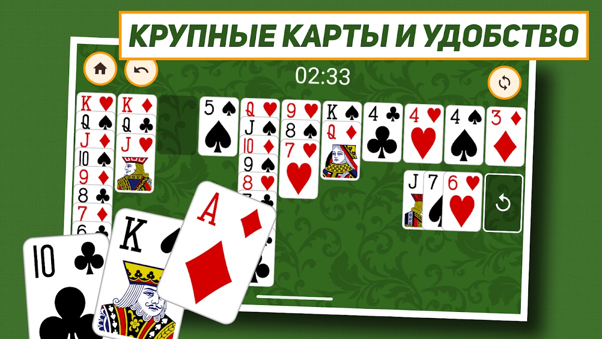 • Крупные карты: Большие, четкие номера и узнаваемые масти. Играйте без напряжения зрения даже на небольших экранах.