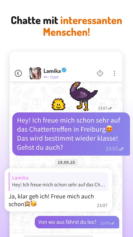 Многие приходят в Knuddels, чтобы найти друзей, регулярно общаться и чувствовать себя менее одинокими. В сообществе возникают разговоры, и из них вырастают настоящие связи. Здесь вы можете познакомиться с людьми, завести друзей и почувствовать себя частью сообщества.
