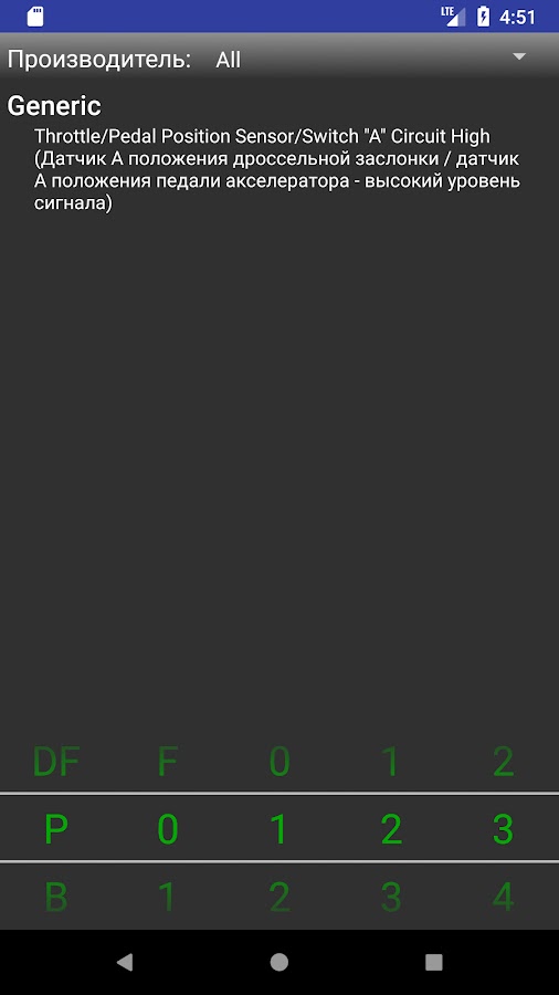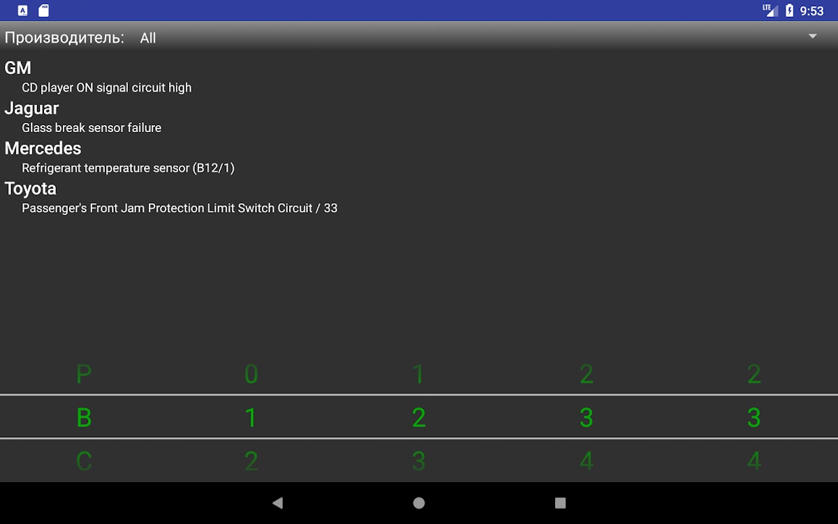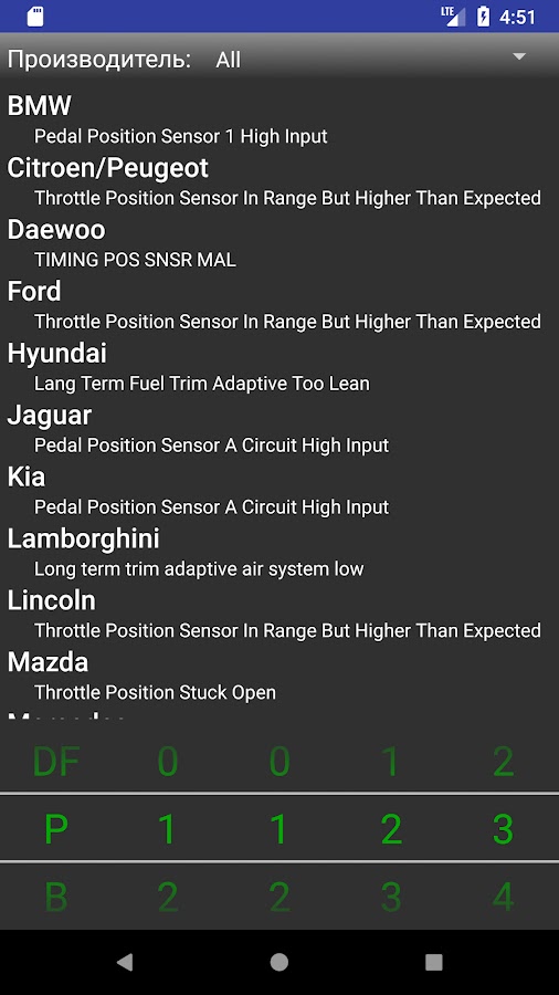 Приложение очень просто в использовании! Вам не надо даже указывать производителя вашего автомобиля. Просто введите нужный диагностический код и приложение покажет все доступные толкования.