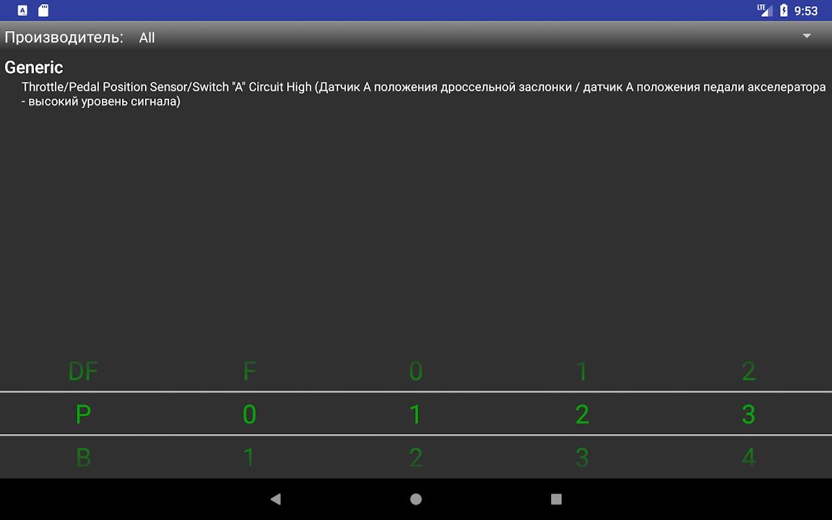 Это приложение представляет собой базу данных диагностических кодов ошибок OBD II (EOBD). Это облегчённая версия с рекламой, которая содержит только 1853 описания основных ошибок с переводом на русский язык. Это коды от P0001 до P099F. Дополнительно вы можете узнать, присутствует ли описание расширенного кода в полной версии.