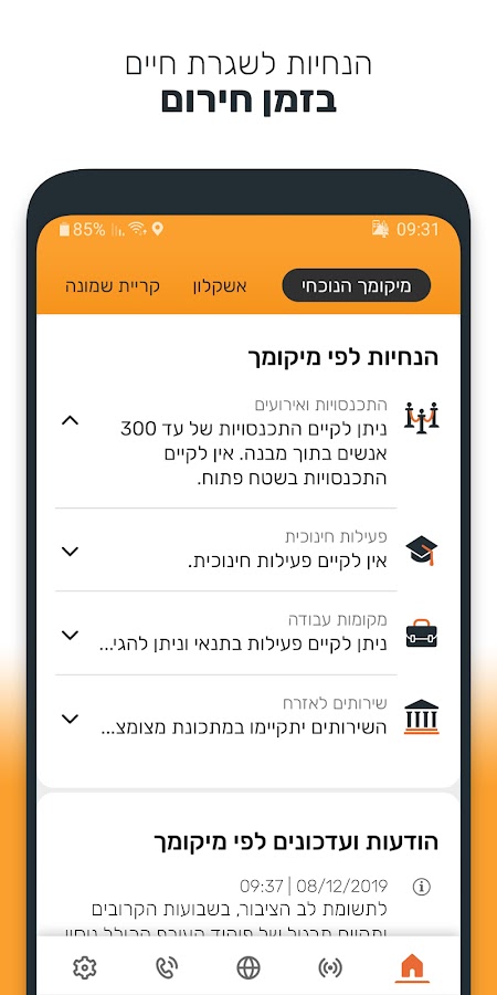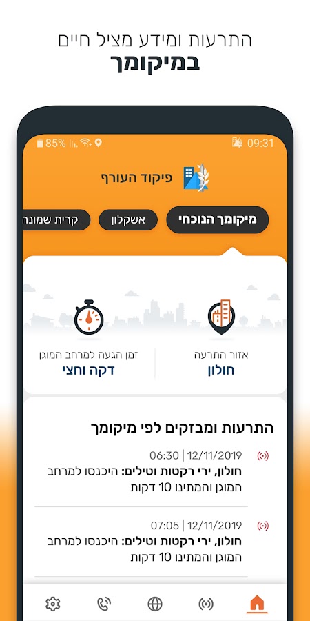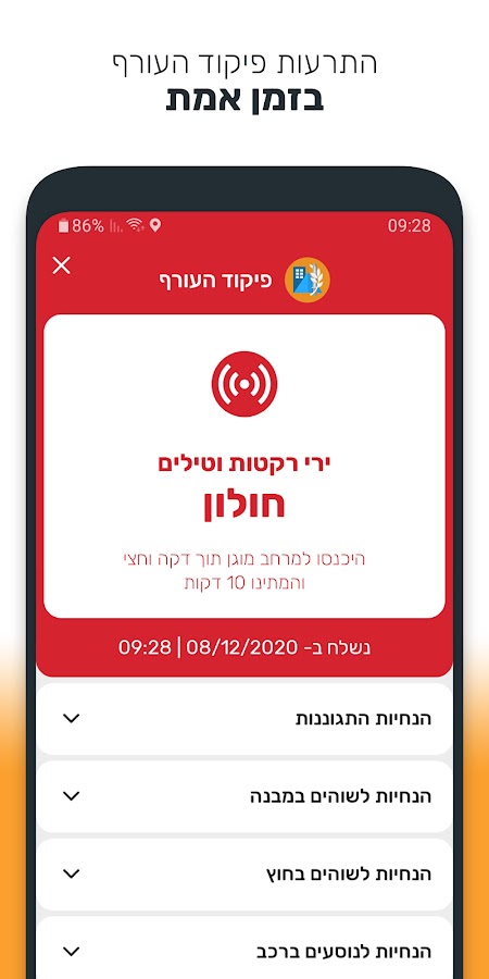 Официальный виджет Командования тыла предоставляет предупреждения, инструкции и важную информацию в реальном времени в соответствии с вашим местоположением и интересующими вас районами по вашему выбору. В виджете вы можете получать важные обновления во время чрезвычайной ситуации и связываться с командованием тыла. Виджет доступен на иврите, арабском, русском и английском языках