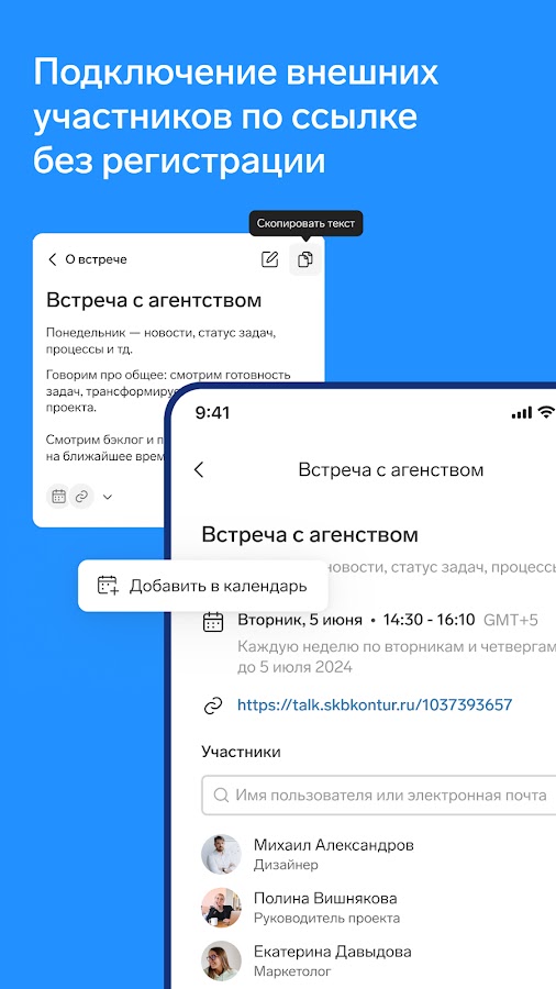 Толк объединяет команды в едином рабочем пространстве для эффективного взаимодействия. Проводите встречи, совещания, онлайн-мероприятия и обучение в защищенной среде. Сервис внесен в реестр российского ПО, все данные шифруются современными протоколами и хранятся на серверах в России.