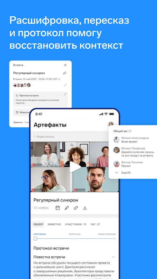 – Текстовая расшифровка, автоматический пересказ встречи и структурированный протокол от ИИ