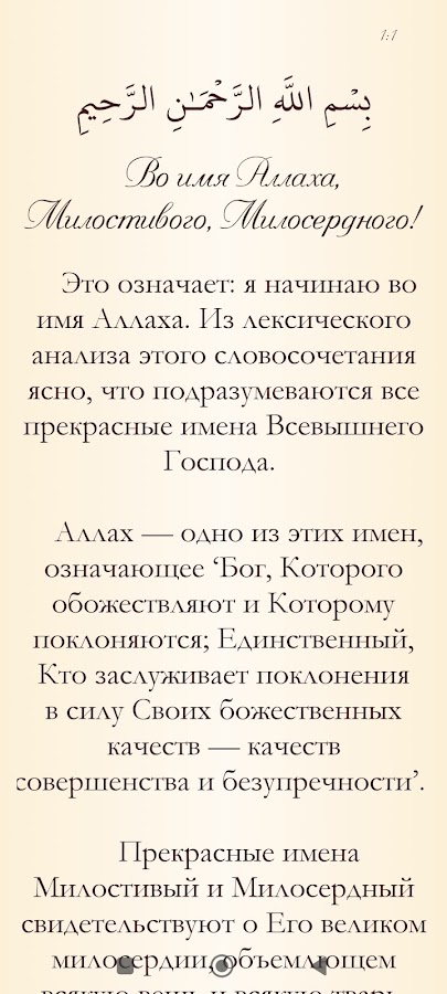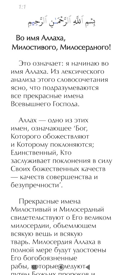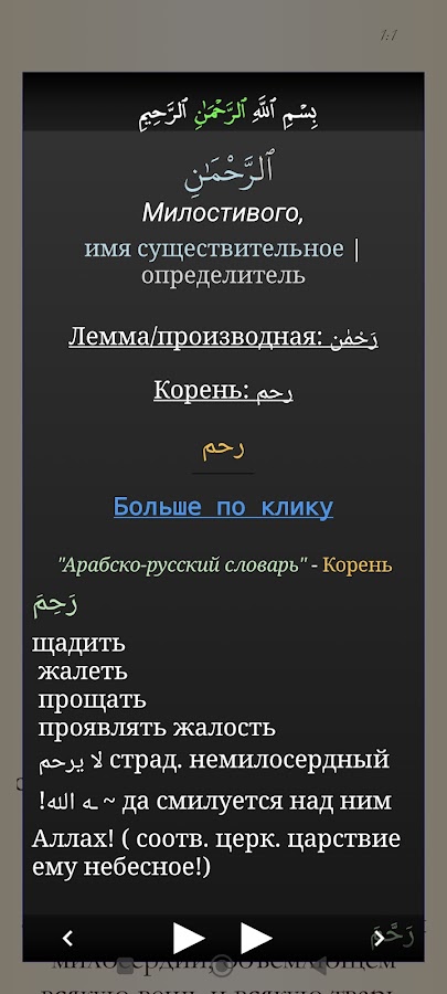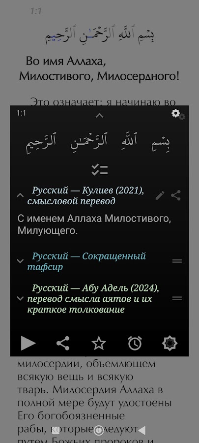 Плавное воспроизведение аудио с переключениями на смысловой перевод и тафсир