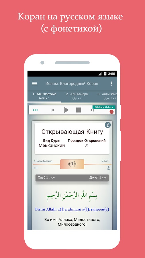 • Слушайте и изучайте чтение Корана с величайшими чтецами (Кари / Шейх / Имам), такими как Мишари Алафаси, Саад Аль-Гамиди, Ас-Судайс или АбдулБазит АбдулСамад (Муратталь, Муджаввад).