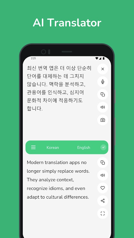 Благодаря нашему интуитивно понятному интерфейсу вы можете легко переводить слова, фразы и предложения с корейского на английский в режиме реального времени. Наш продвинутый искусственный интеллект обеспечивает точные переводы, учитывая нюансы обоих языков.