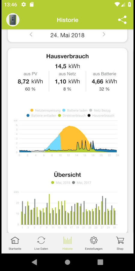 В разделе «История» вы можете отобразить исторические данные вашей системы в графическом виде. Здесь вы можете переключаться между ежедневными, ежемесячными, годовыми и общими значениями домашнего потребления и производства. Вы можете снова изменить эти представления о домашнем потреблении и производстве с помощью «смахивания».