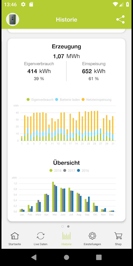 В нижней части вы увидите обзор соответствующих значений (домашнее потребление/производство). Данные за последние доступные периоды сравниваются в еженедельном, ежемесячном или годовом периодах. Это означает, что вы можете сразу увидеть, увеличилась или уменьшилась ваша прибыль по сравнению с предыдущими годами.