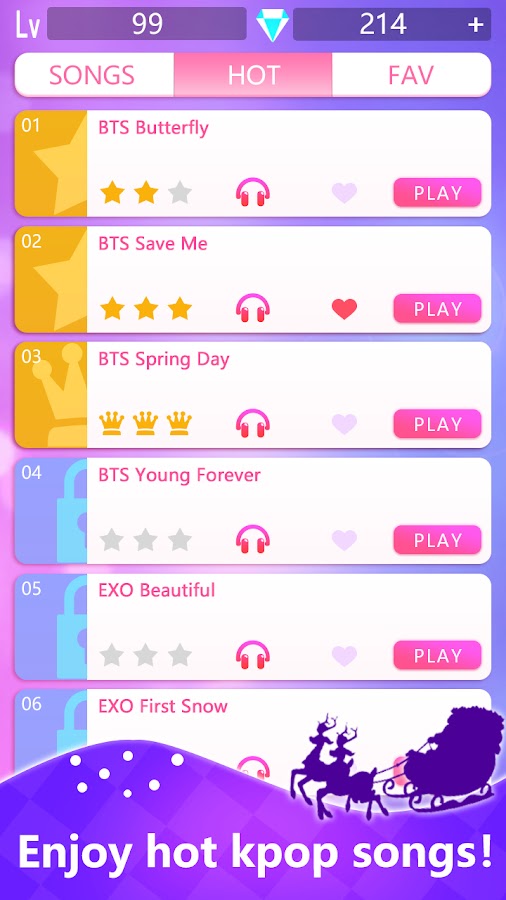 Вы можете играть на пианино и тренировать свою реакцию в этой игре. Веселее, если в нее играют вместе с друзьями. Помимо K-pop музыки, мы также подготовили для вас много классических фортепианных песен. Есть много вариантов для вас.