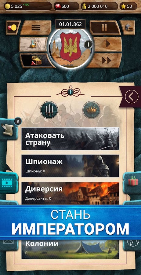 Стань великим князем Киевской Руси, королем Франции, императором Священной Римской империи, Византии или Японии. Выбирай любую из 60+ стран под свое руководство. Тебе предстоит взять полноту власти в свои руки и развивать свою страну, принимать важные решения по внутренним и внешним делам, а также управлять экономикой и внешними отношениями.