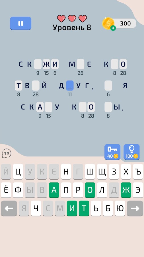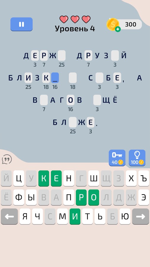 Если вдруг у вас возникла сложность в Криптограммы — буквы и цифры с расшифровкой цитаты, вам на помощь придёт возможность воспользоваться двумя видами подсказок. Первый вид раскроет вам одну букву, а второй – раскроет вам целое слово.