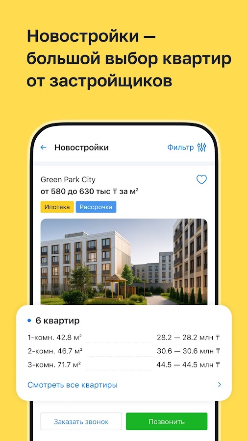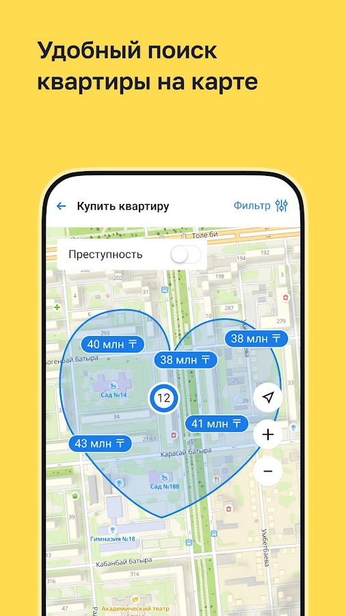 • Мәмілеге арналған тиімді құралдар — пәтерді бағалау, хабарландыруларды картадан қарау, баға аналитикасы, іздеуге жазылу, таңдаулы хабарландырулар топтамасы