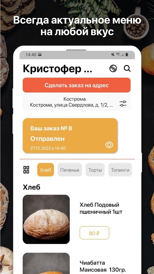 Мы предлагаем десерты, салаты, готовые блюда, выпечку, хлеб. Вы можете купить всё это в нашем кафе или заказать доставку.