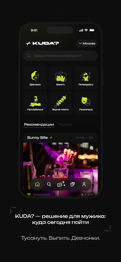 KUDA? — это навигация по отобранным вручную заведениям, где будет кайфово мужчине или девушке, если тебе нравится «мужской отдых».
