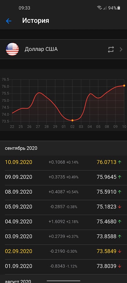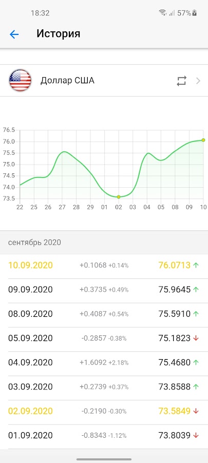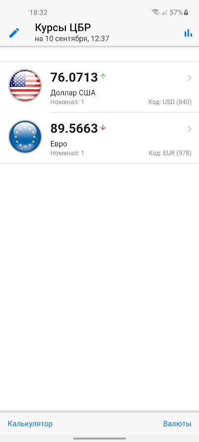 Для каждой валюты есть возможность посмотреть динамику изменения в табличном и графическом виде. Так же можно увидеть стоимость обмена одной валюты на другую. На главном экране есть простой калькулятор валют.