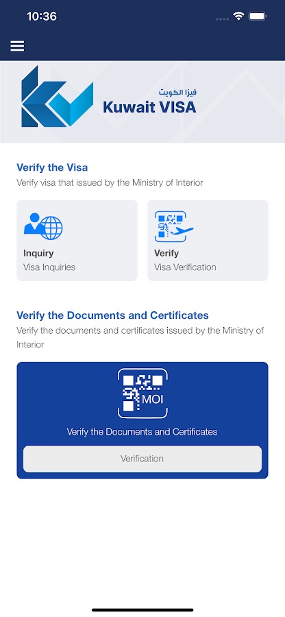 «Кувейтская виза», мобильное приложение Министерства внутренних дел, которое способствует сокращению манипуляций и мошенничества с въездными визами экспатов и обеспечивает быструю и точную электронную проверку перед посадкой на самолет и въездом в государство Кувейт.