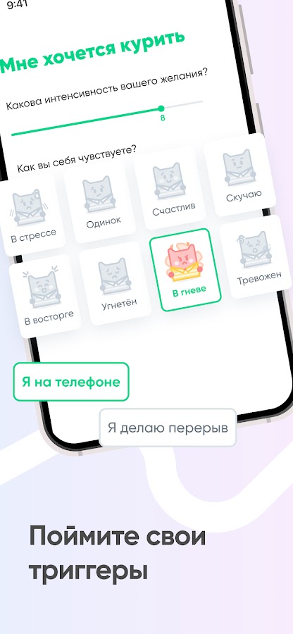 Квит использует когнитивно-поведенческую терапию (КПТ), чтобы помочь вам справиться с побочными эффектами отказа от курения и предоставить вам индивидуальные стратегии противостояния желанию закурить. С Квит вы сможете окончательно распрощаться с сигаретами и с вейпом!