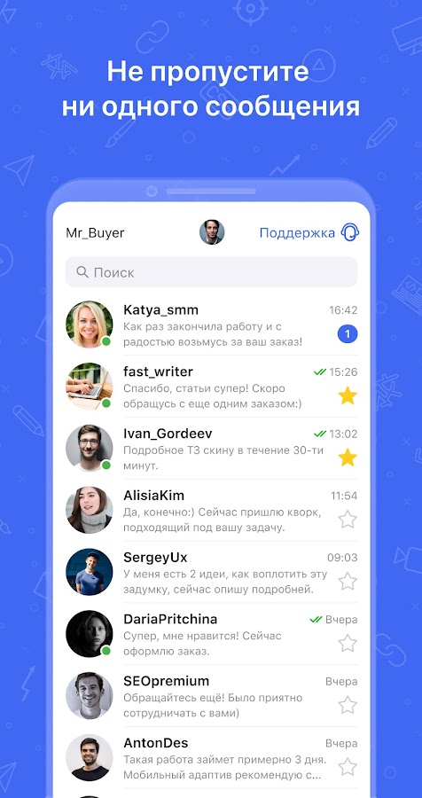 Чат. Общайтесь с фрилансерами и заказчиками в удобном мессенджере, обсуждайте детали будущего заказа, обменивайтесь файлами. Будьте всегда на связи.